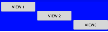 ▼ 위 설명에서 Linear_Layout의 gravity 속성은 해당 Layout의 모든 하위 뷰들에 대한 중력 방향을 결정한다고 하였습니다. 결과 화면상의 blue 영역이 Linear_Layout의 영역입니다. 해당 Layout의 모든 하위 뷰 (View1, View2, View3)가 bottom 영역에 배치되는 것을 확인할 수 있습니다. 그렇다면 위 샘플예제에서 View1과 View2의 layout_gravity 속성을 각각 "top"과 "center"로 지정해보겠습니다.