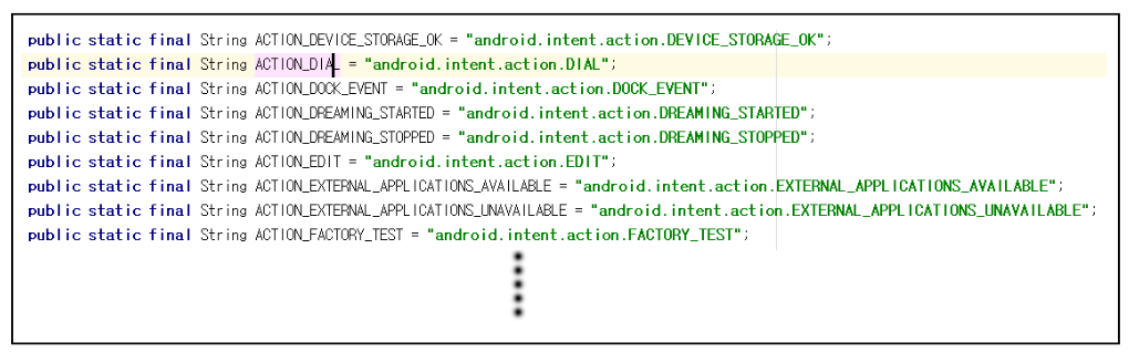 동작을 실행하는 미리 정의된 문자열을 의미합니다. 아래와 같이 Intent 클래스의 static String Type으로 이미 정의되어 있습니다.