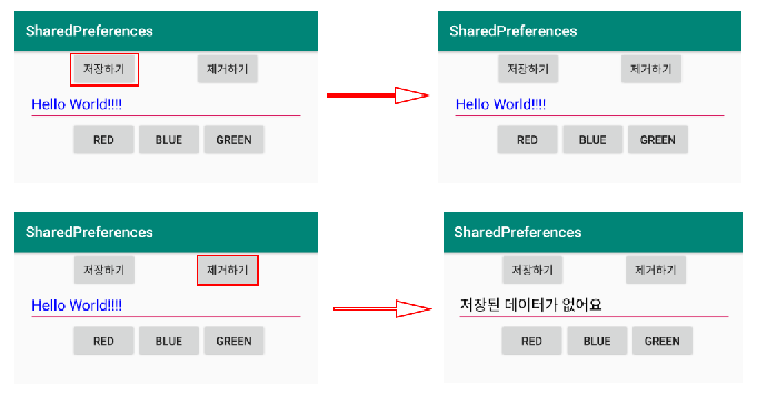 ▼ 저장하기 버튼을 클릭하였을 때는 SharedPreferences에 현재 EditText의 Text값과 Color 값이 저장이 되며 제거하기 버튼을 클릭하였을 때 SharedPreferences의 모든 데이터를 제거하도록 구현할 것입니다.