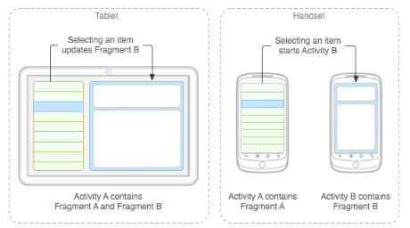 예를 들어 Fragment A는 애플리케이션의 콘텐츠 목록을 표시하는 UI를 담당하고 Fragment B는 선택된 콘텐츠 목록에 해당하는 콘텐츠를 표시하는 UI를 담당하는 프래그먼트라고 가정하겠습니다. 화면의 크기가 큰 태블릿에서는 A 액티비티 안에서 Fragment A와 Fragment B를 조합하여 한 화면에 출력하는 게 가능한 반면 크기가 작은 일반 모바일 단말기에서는 액티비티 A에 Fragment A를 포함시켜 한 화면으로 출력하고 액티비티 B에서 Fragment B를 포함하여 한 화면에 출력하도록 구현하고 있습니다.